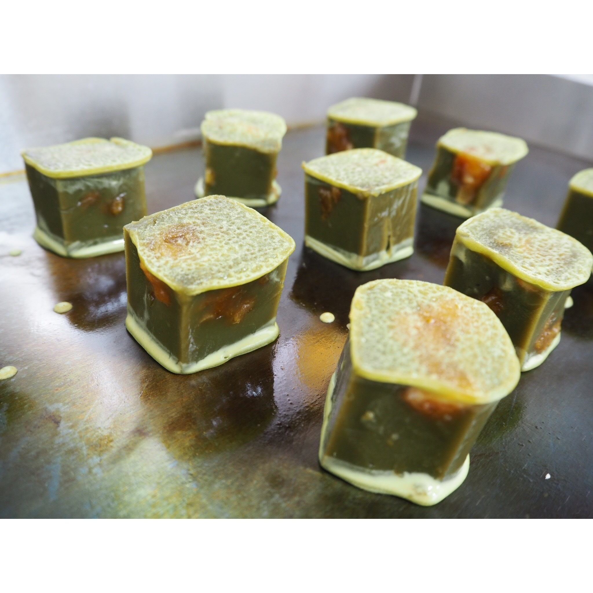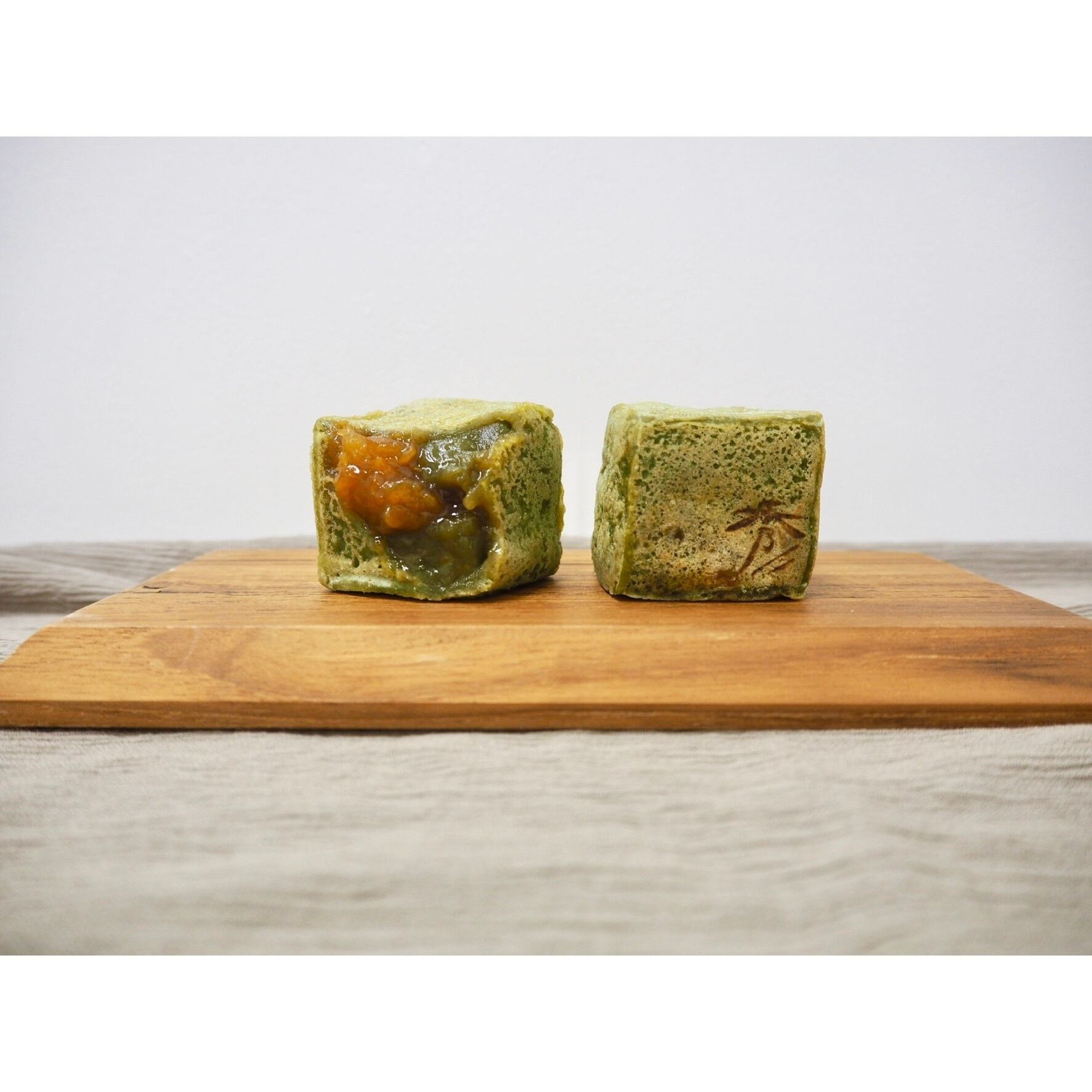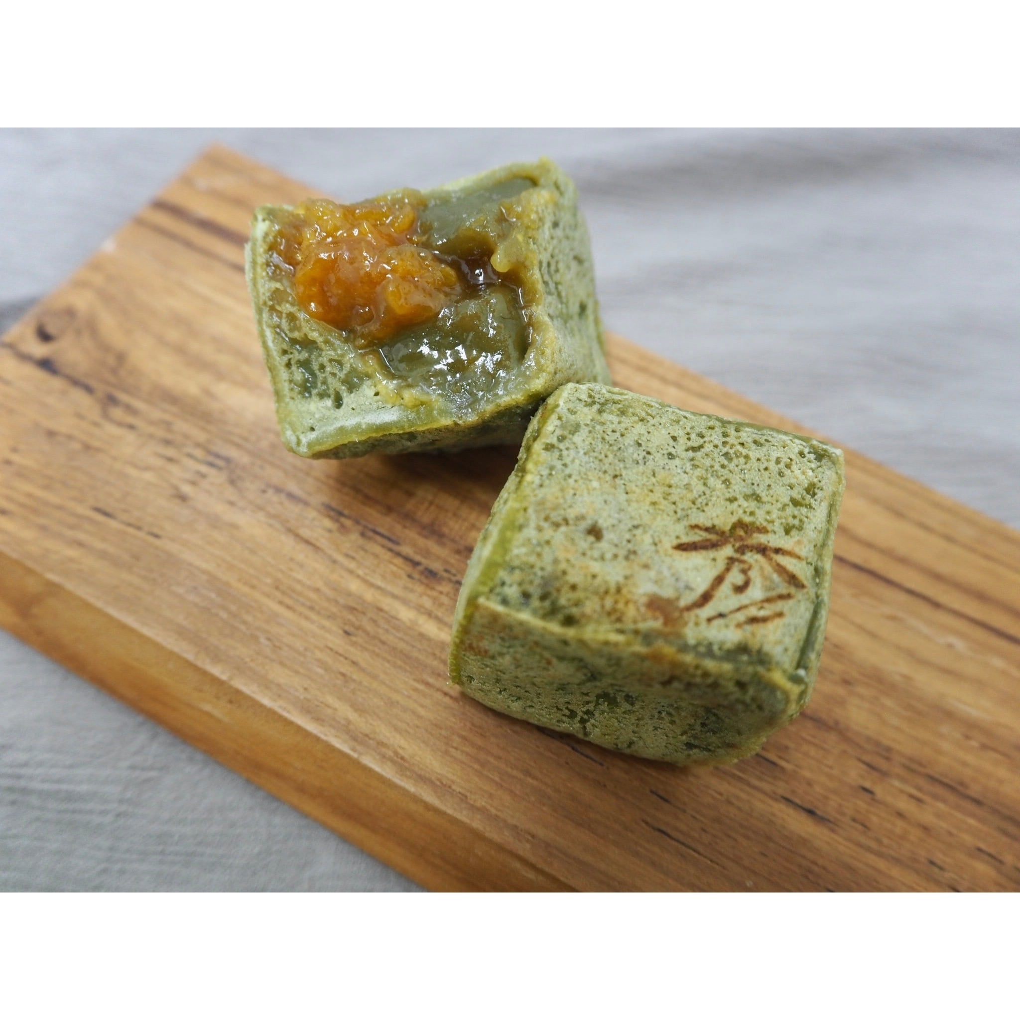国産抹茶を使用した濃いめの抹茶餡に、とろっと甘酸っぱい杏のコンフィチュールを落とし込んだ季節限定のきんつばです。