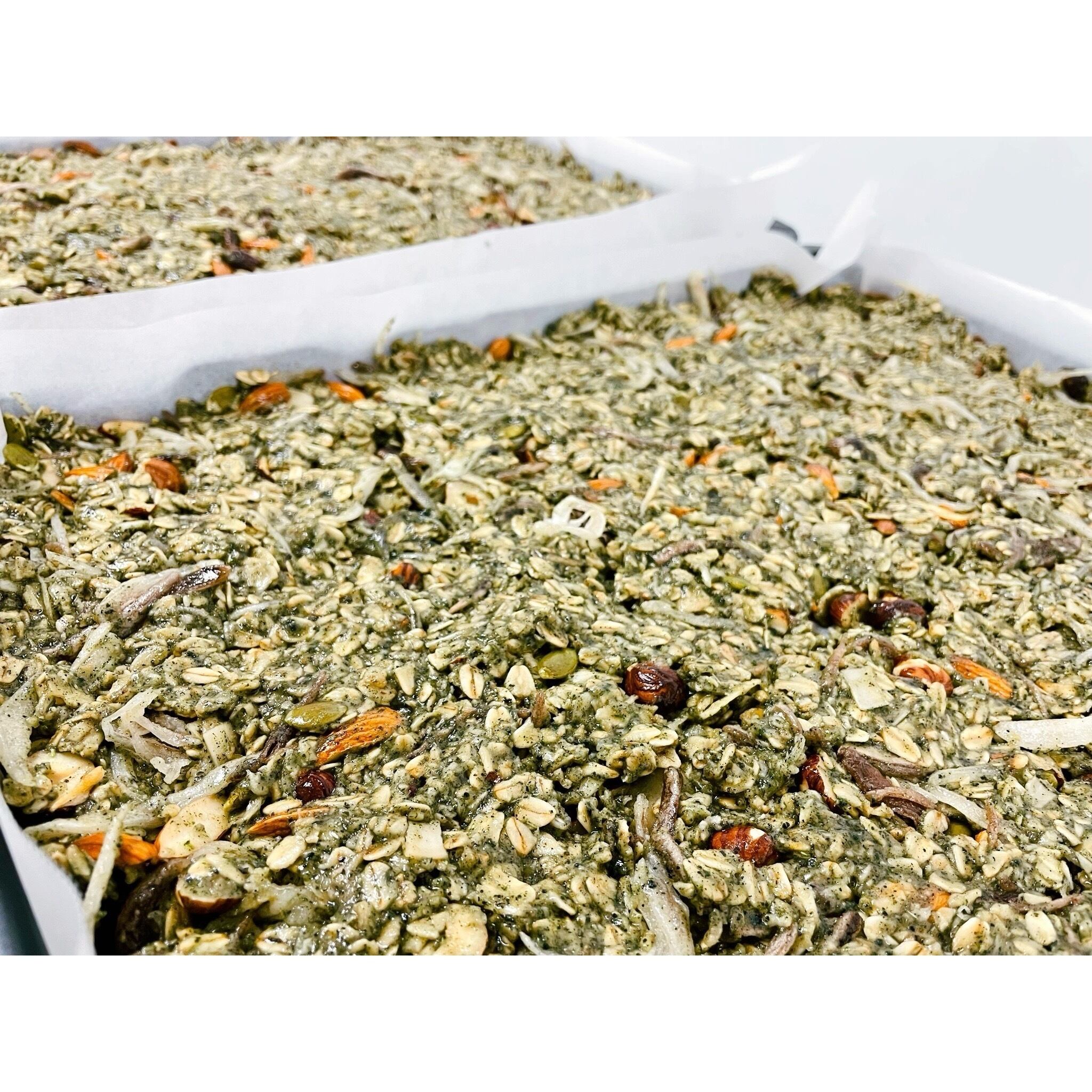 〈原材料〉オーツ麦(カナダ産)、きんつばのみみ(白玉粉、米粉、タピオカスターチ、米飴、砂糖/トレハロース)、砂糖、米粉、米油、アーモンド、ヘーゼルナッツ、豆乳、みりん、レーズン、伊予柑ピール(伊予柑皮、砂糖/クエン酸、酸化防止剤(ビタミンC))、ココナッツ、かぼちゃの種、乾燥よもぎ、ごま、かぼちゃパウダー、塩(一部に小麦・大豆・ごま・アーモンドを含む)