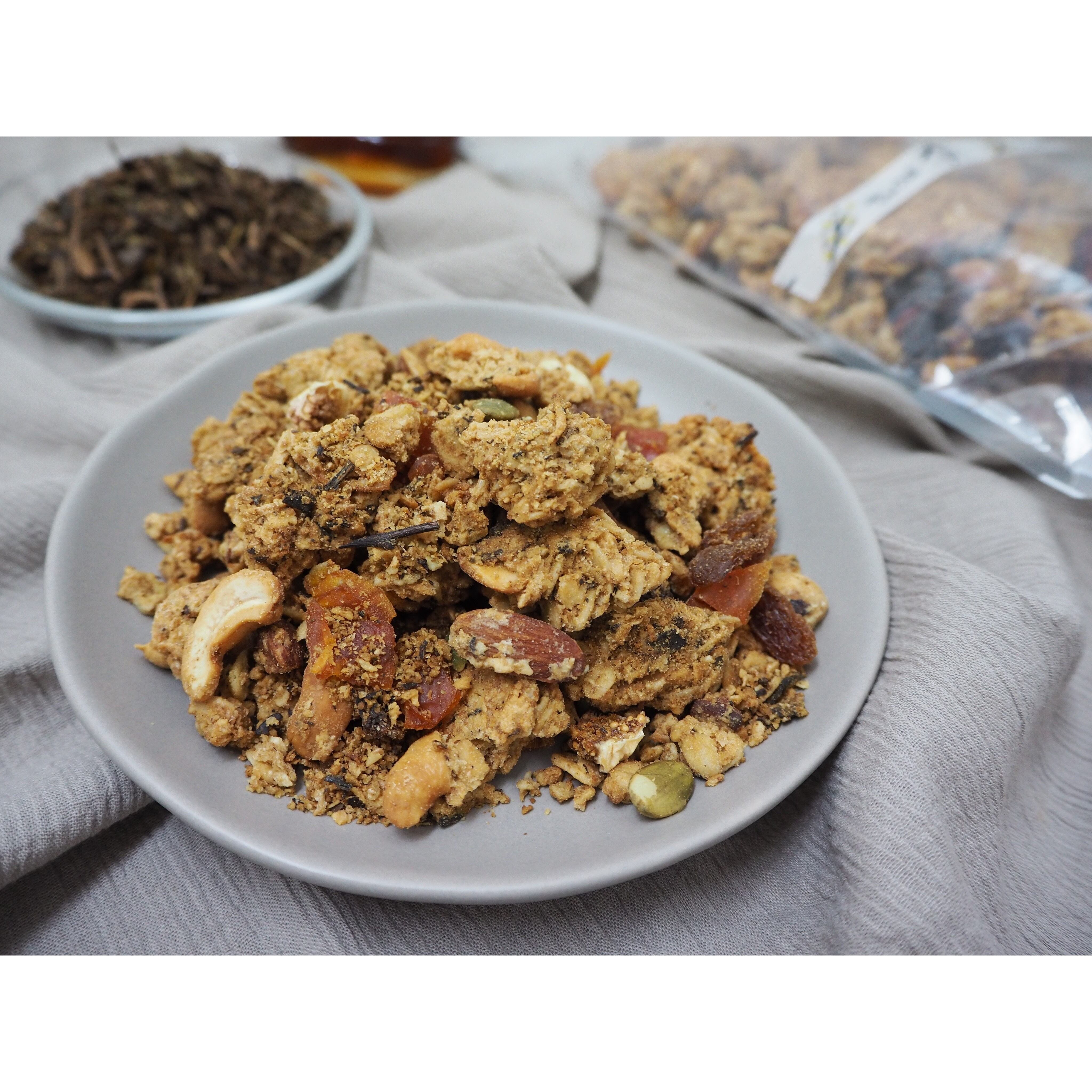 グラノーラ生地にほうじ茶を混ぜ込み、メープルシロップで甘さを加えました。
