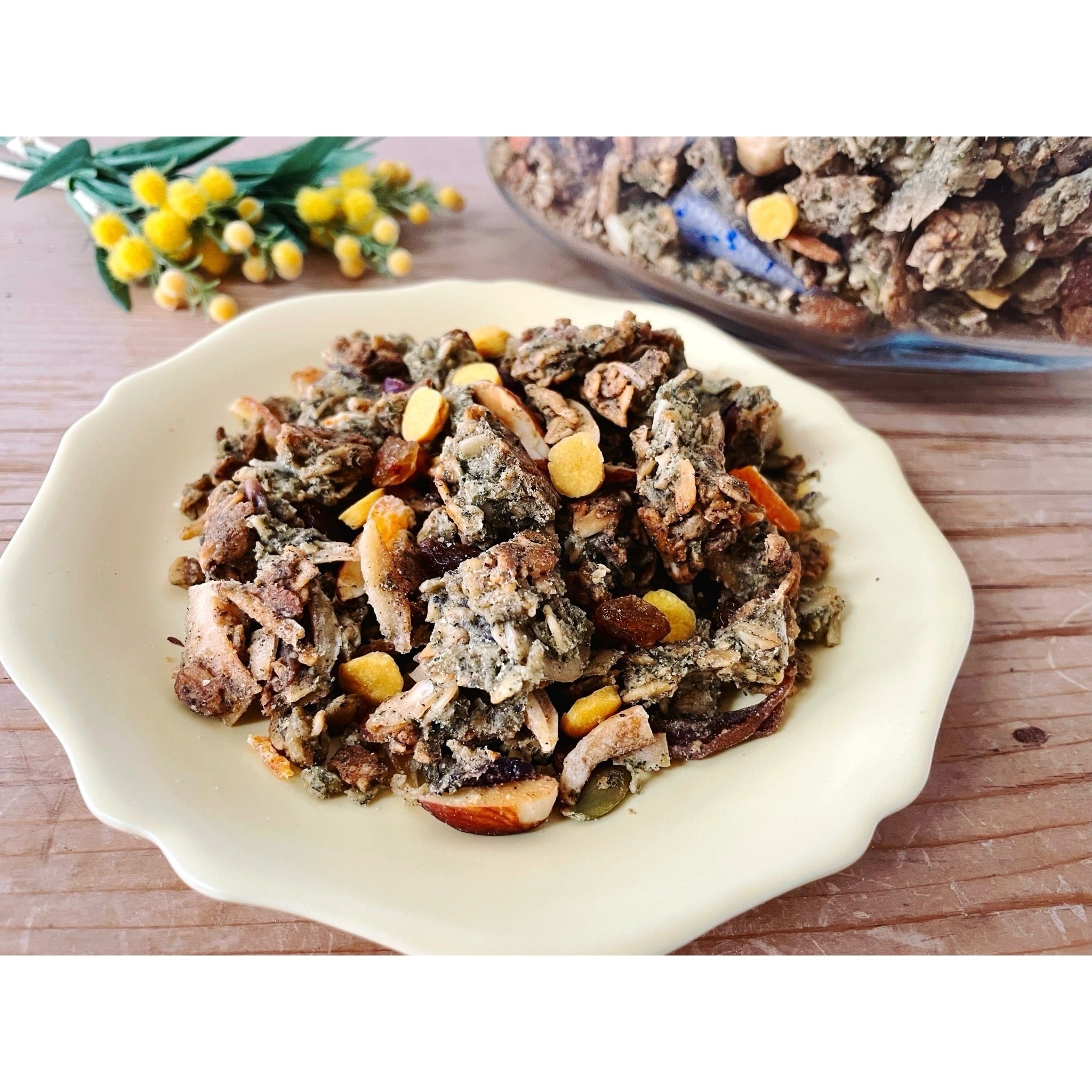 ★ よもぎを練り込んだ淡い緑のグラノーラ生地に、ミモザモチーフの米粉のクッキーをあしらった春の装いのグラノーラです♪