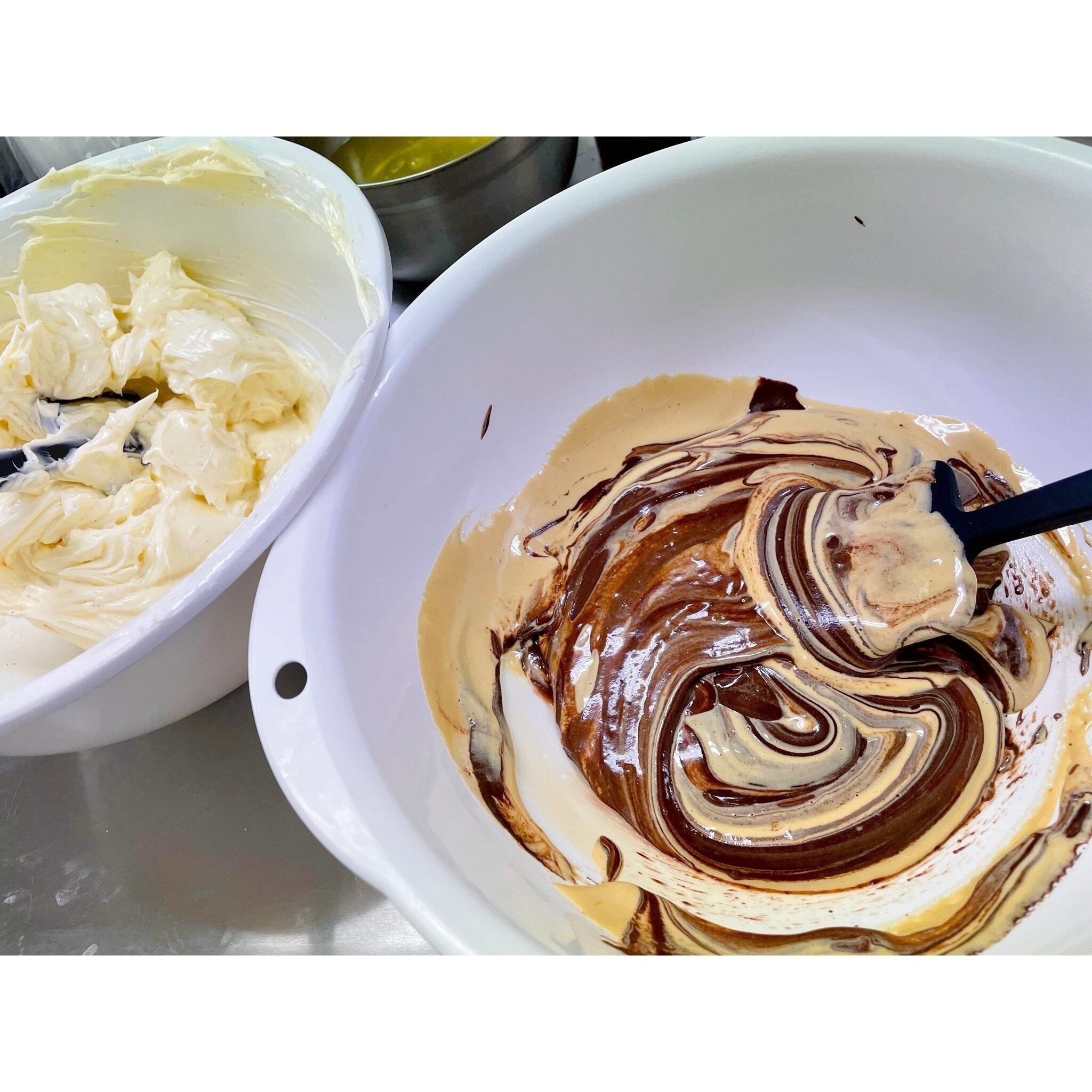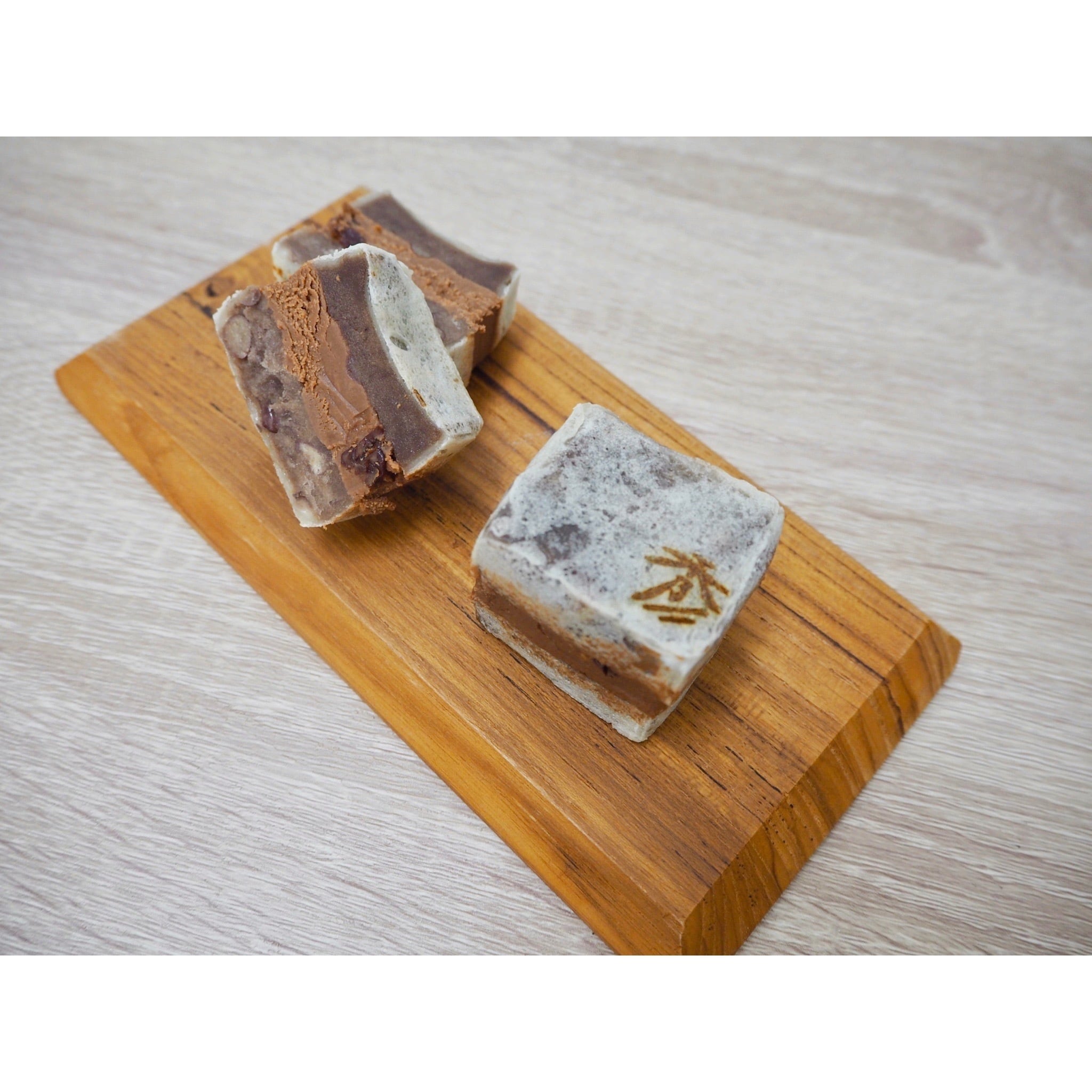 ベースのラムレーズン入りバタークリームに、フランス産のチョコレートをたっぷりと練り込んだ濃厚なショコラバタークリームを秀のきんつばでサンド。